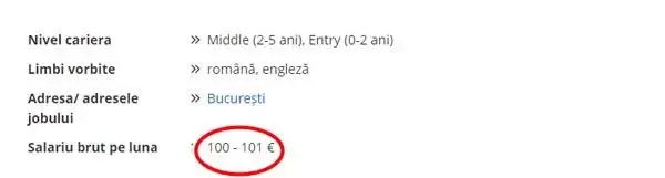 De ce spun asta? Pentru că angajatorul oferă fabuloasa sumă de…100-101 euro BRUT pentru tot acest deranj și pentru îndeplinirea unei fișe a postului mai stufoasă ca Bigfoot.