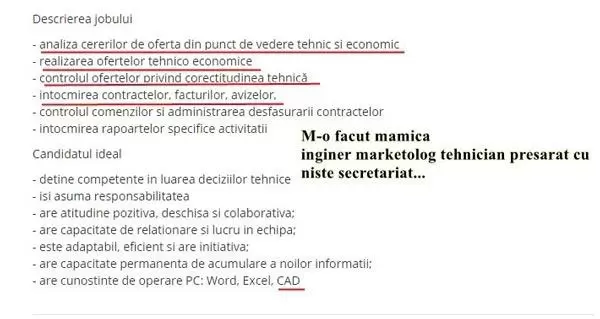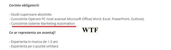 Trecând peste lipsa corectitudinii gramaticale a formulării (se cere cunoștințe, maică, nu noi facem regulile, dacă se cere, se cere), nici conținutul nu salvează acest anunț, ba chiar îl afundă într-o gaură neagră a incompetenței HR-iste.
