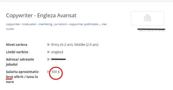 De reținut faptul că acest angajator nu recrutează un Junior, ci un Copywriter cu cunoștințe avansate de engleză, căruia îi oferă 300 euro BRUT.