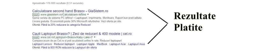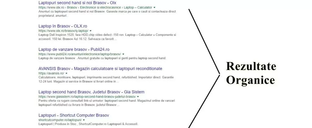 How do we differentiate organic search results from paid search results? Well, if you search for anything on Google (e.g. – laptops in Brașov), the first results that you’ll see in the top half usually have the word ad written before the link. These are sponsored ads.